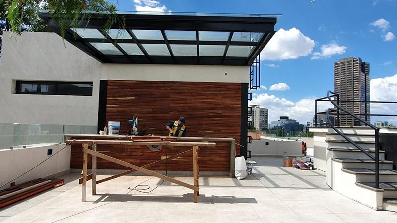 Armado y construcción de pergola para cristal. Se realizó el armado de acero para la colocación de cristal en el área de roof garden, en la que se cuidaron detalles como la orientación, materiales utilizados, el proceso adecuado para le manejo de material y la estructura que sostenía el cristal.